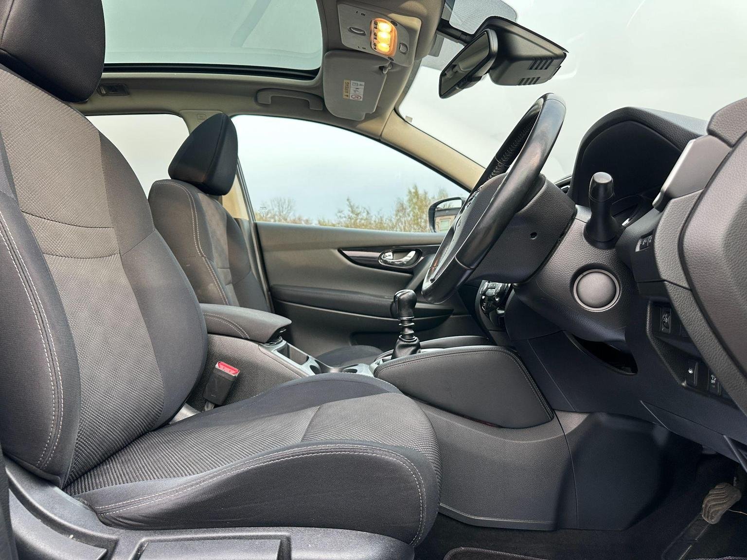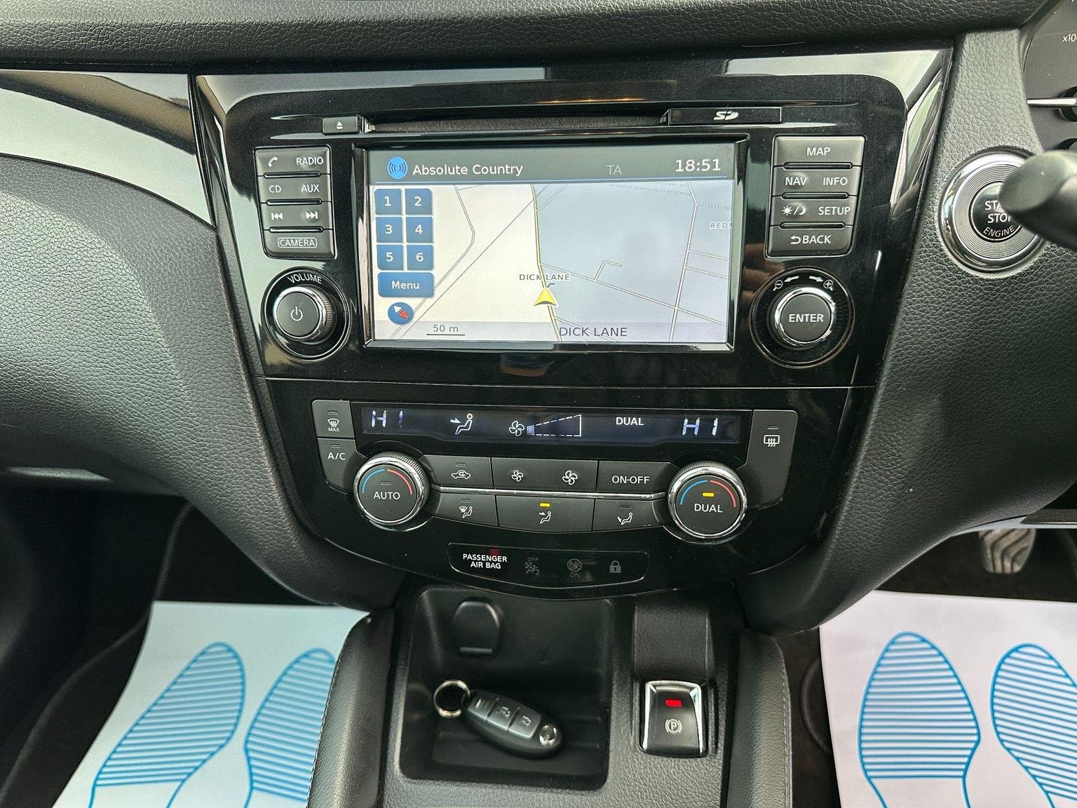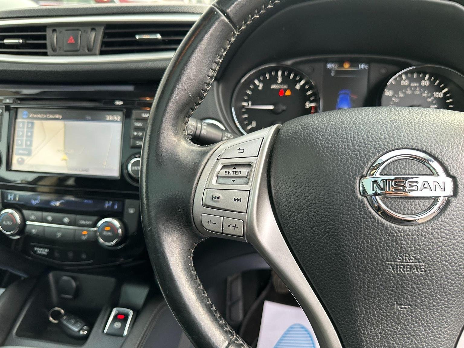 Auto Dimming Rear View Mirror, Auto Rain Sensing Wipers, Black Honeycomb Front Grille, Body Coloured Handles, Brake Assist, Bumpers - Body Coloured, Chrome Glass Surround, Climate Control - Dual Zone, Cruise Control with Speed Limiter, DAB Radio, Door Mirrors - Body Coloured, Door Mirrors - Power Fold and Heated, Driver Seat Height Adjustment, EBD - Electronic Brakeforce Distribution, ESP - Electronic Stability Programme, Electric Speed-Sensitive Power Steering, Front Armrest, Front Collision Avoidance, Front Fog Lights, Front and Rear Electric Windows, Head Restraints - Active Front, Head Restraints - Rear, Headlights - Auto, Headlights - Auto High-Low Beam, Hill Start Assist, ISOFIX Childseat Anchorage Points - Middle Row Outer Seats, Immobiliser, Intelligent Key, Interior Ambient Lighting, LED Daytime Running Lights, Lane Departure Warning, Leather Gear Knob, Leather Steering Wheel, Luggage Board System, Lumbar Support, Panoramic Glass Roof, Parking Sensor - Front, Pollen Filter, Puncture Repair Kit, Push Start-Stop Button, Radio-CD, Rear Cupholder, Rear Door Child Locks, Rear Parking Sensor, Rear Privacy Glass, Rear View Camera, Satellite Navigation - Nissan Connect, Service Indicator, Smart Vision Pack, Speed-Sensitive Autolock Function, Steering Wheel Mounted Audio Controls, TPMS - Tyre Pressure Monitoring System, Telephone - Bluetooth Integration, Tilt and Telescopic Adjustable Steering Wheel, Touch Screen 7in, Traction Control, Traffic Sign Recognition, Trip Computer, USB Port, e-PKB - Electric Parking Brake, 17in Alloy Wheels - 5-Spoke in Silver, 6 Speakers, 60-40 Split Rear Folding Seats, ABS - Anti Lock Brakes, AUX-In Socket, Airbag - Driver, Airbag - Passenger, Airbags - Curtain, Airbags - Side, Alarm, Armrest - Rear